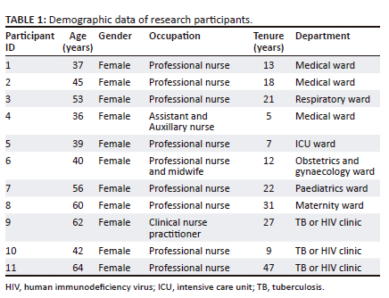 The research was conducted at a public hospital in Gauteng province, South Africa. The first author negotiated access to the nurses with the assistance of the hospital social worker. Purposive sampling was used to get the first participants, based on their relevance to the research questions and shared experiences of the pandemic. Thereafter, snowball sampling was used to get additional participants after the initial participants started to refer or invite other participants. Snowball sampling is based on a chain reaction process, where a chosen participant will either invite or refer someone else to participate in the study. Eleven nurses from six wards in the hospital who were able to use Zoom or were available to meet face-to-face were interviewed by the first author, using semi-structured interviews. Because of the open-ended nature of questions in semi-structured interviews, the authors can revise and allow the emergence of new questions in order to derive a more in-depth understanding during an interview of participants' lived experiences. Data saturation was eventually reached based on the data received from all the participants and the similarity in the responses.