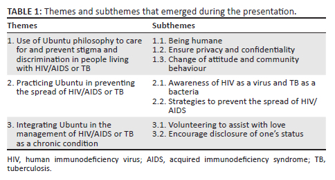 Theme 1: Use of Ubuntu philosophy to care for and prevent stigma and discrimination in people living with HIV/AIDS or TB