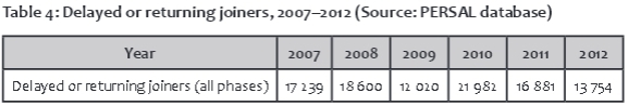 The figures for delayed or returning joiners in all phases for the years 2007 to 2012 are shown in Table 4.