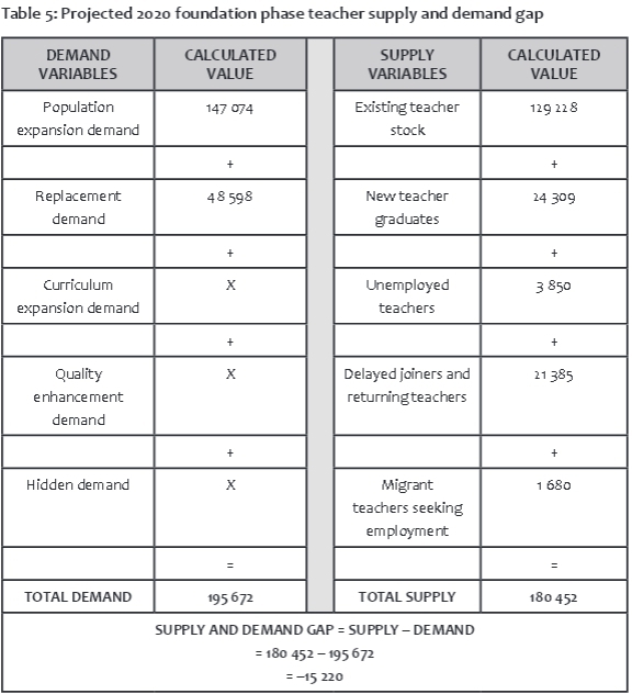 • South Africa is not producing enough new foundation phase teachers, and a 2012-2020 pragmatic supply and demand projection indicates that even by 2020, demand for foundation phase teachers will still largely outstrip supply.