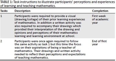 The writing brought further clarity and expression to their view on learning and teaching mathematics. In addition the data collection activities allowed for triangulation. Table 1 provides a description of the two specific tasks that were given to the at-risk mathematics first-year students in the intervention class. The first task was completed shortly after students consented to participate in the study. The second task was completed towards the end of the academic year, after participants had attended mathematics tutorial classes for the year. The reasoning was that a period of intervention may have had a positive effect on these at-risk students' attitudes towards mathematics, especially in their roles as future teachers of the subject. Participants would also have had some teaching practice experience.