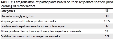 Participants were also categorised in terms of their responses varying from overwhelmingly negative to positive remarks which is illustrated in Table 3. Table 3 indicates that 30% of the participants indicated overwhelmingly negative attitudes towards the learning of mathematics. Some participants (18.5%) made very negative remarks, but included a few positive remarks. Over a third of the participants (37%) had positive and negative remarks that were equally represented. A small number of participants (11%) made more positive remarks with very few negative remarks whilst a negligible number of participants (3.5%) made only positive remarks about their experiences as learners of mathematics. The variation in responses represent the complex nature of exploring attitudes (Pickens 2005) that are formed by different evaluative processes (Hannula 2002).