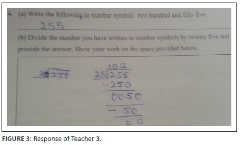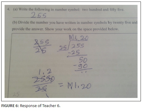 In a second question in this domain, teachers were asked to write a number word as a number symbol (255) and to then divide the number that they had written by 25. The overall results of this question revealed that 87% of teachers were able to cope with this question. However, 13% of teachers seemed to have different understandings and knowledge in this regard. Some teachers made the error of writing two zeros at the end of the number, which resulted in changing of the value of the number into 25 500. Another error was the inclusion of the decimal point between the number and the two zeros as the last digits of the number. Some included the letter M, which stands for the local currency (maloti), effectively resulting in an amount of money and not a number.