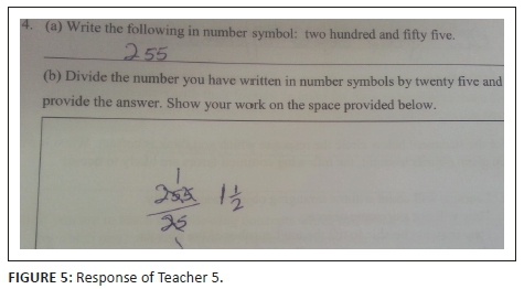 However, 38% of the teachers were unable to carry out the division task correctly. For instance, the response by Teacher 5 in Figure 5 illustrates some confusion.