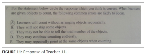 Teacher 11 circled the first statement in Figure 11 and did not circle the other three statements (C, D and E), while other teachers circled two or three statements. However, 17% of teachers were able to circle all four statements that portray errors that Grade R learners are likely to do while counting; for instance, refer to the response of Teacher 2 in Figure 12.