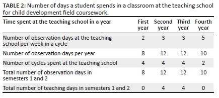 The students do their field or clinical observation tasks over the first 3 years of a 4-year undergraduate initial teacher qualification in the university-affiliated teaching school. In the fourth year of the qualification, the students visit the school only for a short period for observation; the rest of the clinical field work is completed in other schools of placement in areas surrounding the university. Each student teacher is assigned a specific child in their first year of study - thus one Grade R (kindergarten) child is assigned to one FP student teacher and one child in Grade 4 is assigned to a student teacher in the IP - whom they 'follow' four years. The students spend time in the school during practicum in the classroom observing their assigned child from the first year to the fourth year. In the first three years of study, the observations are closely linked to the child development coursework. In the fourth year, the interaction is more general when the students spend time at the teaching school. This is because in this university's programmes the students spend 18 weeks dispersed throughout their fourth year in schools off campus where they do clinical field work and teaching practicum. They have less time in their fourth year to spend with their assigned child, but still get some time for occasional interaction.
