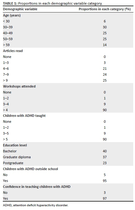 Table 1 shows the proportions in each category of a demographic variable. All the 95 teachers who participated in this study were women, with 80% of them aged between 30 and 59 years. In total, 60% of the teachers had read at least seven articles and 77% had attended at least three workshops. Only 3% of the teachers were not confident about teaching children with ADHD, whilst 5% did not know children with ADHD outside the school.