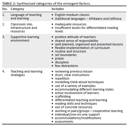 The teachers were committed to inclusive teaching in their classrooms, in particular investigating a great deal of effort to effectively teach the children in their classes who experienced barriers to learning. There was a shared sense of responsibility amongst the stakeholders, a supportive classroom environment, well-planned, organised and flexibly presented lessons, emphasis on the importance of reading, use of a variety of teaching strategies allowing for varied engagement and diverse learning styles, and the early identification and intervention of learners experiencing barriers to learning.