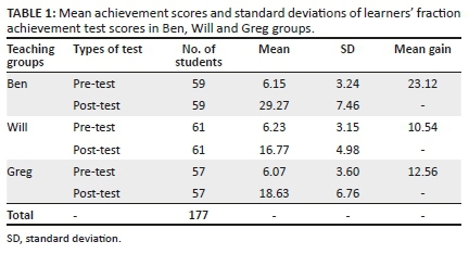 RESULTS: The quantitative data were analysed using descriptive statistics and analysis of covariance (ANCOVA), whilst the qualitative data were analysed in themes. The results showed that learners of teacher Ben performed significantly better than those of teachers Will and Greg. The findings revealed that a combination of good practices and appropriate use of multiple representations by teacher Ben improved his learners' achievement in addition of fraction more than other learners taught by the other two teachers.