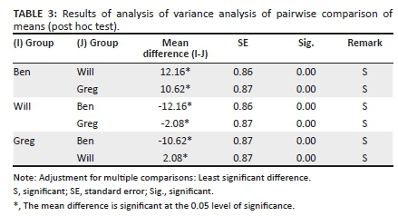 Table 2 shows the summary of the one-way ANCOVA table on learners' post-test scores on the achievement of fraction by teachers Ben, Will and Greg. From the data in the table, it is evident that there is a significant difference between the mean achievement scores of learners in the different groups at 0.05 level of significance. This is because the p-value is 0.00. Since the p-value of 0.00 is less than 0.05, we reject the null hypothesis. Hence, there is the need to statistically find out which teaching group actually caused the significant difference in the study using the use of pairwise comparisons test (post hoc test).