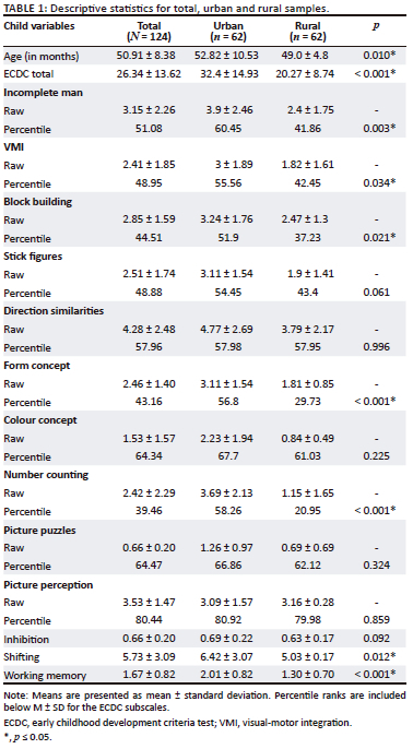 This was the first study to assess associations of EF with pre-academic skills in young South African children. It was important to include both urban and rural settings and look at the potential differences in these settings in order to guide future work and to better understand children's cognitive and educational development in context to avoid merely adopting findings, recommendations and interventions that are derived from highly dissimilar HIC contexts. This study aimed to describe EF and pre-academic skills in a sample of South African preschool children from urban and rural low-income settings, and to answer two research questions: (1) whether EF and pre-academic skills would differ between children from urban and rural settings; and (2) whether there would be an association between EF and pre-academic skills that would extend the evidence for this relationship to this understudied, LMIC context.