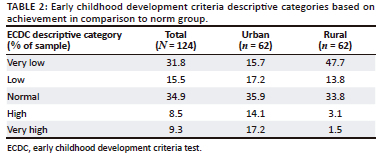 The finding that children from the urban setting outperformed children from the rural setting highlights the fact that even within the same LMIC, low-income settings and the needs of each setting can differ. Although the current study did not set out to identify those factors that may be contributing to poorer performance among the rural children, factors such as limited access to essential services (Biersteker 2012) and high-quality preschools or early learning provision (Richter & Samuels 2018) have been suggested in previous research. In low-income settings in South Africa, early childhood education for children under the age of 5 years remains largely unsupported and unregulated, with most early education centres being run by community-based organisations or low-trained volunteers from the community as was the case in the preschools from the current study (Sherry & Draper 2013).