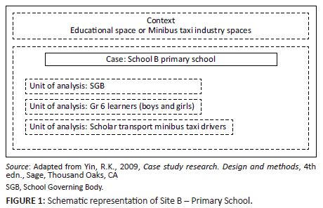 The research reported in this paper addresses the following question: 'What are the views on minibus taxi drivers and their role in supporting education'. The phenomenon studied was based on opinions hence, the study was situated within an interpretivist paradigm. It lends itself to qualitative research with the main focus being the interest in people and the way that they interconnect, what they think, how they form ideas about the world and how their worlds are created (Creswell 2008; Henning, Van Rensburg & Smit 2004; Maree & Van Der Westhuizen 2009; Thomas 2013). A multiple case study design was followed, owing to not having control over the actual behaviour of the participants or the environment in which the participants find themselves; thus, the focus is on the contemporary. The research question sought to explain and understand, in depth, the present circumstances in the minibus industry and education. As a research method, a case study design was used to contribute to our knowledge of individual, group, organisational, social, political and other related phenomena (Yin 2009). The case study design's unique strength lies in its ability to deal with a full variety of evidence. In this study, this included documents, semi-structured group interviews, critical group discussions, questionnaires and observations. Furthermore, multiple case studies were used to investigate the different views held by the various role players (minibus taxi drivers and schools). The use of multiple cases provides the opportunity for a robust study, which strengthens the findings compared to a single case alone (Yin 2009). Figure 1 is a schematic representation of Site B, a Primary School.