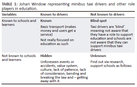 Joseph Luft (1916 - 2014) and Harry Ingham (1916 - 1995) originally developed this model to describe four types of self. The model enables the opening of communication lines with others. The Johari Window provides a look into how we view ourselves and how others view us (Luft 1984; Luft & Ingham 1955). The Johari Window is a model to improve self-awareness and communication. The motivation for the use of the Johari Window in this study was, firstly, to explain the reason for the research to participants. Secondly, it was used to determine how the different role players in the minibus taxi industry and education viewed their respective roles. The adapted Johari window displayed in Table 1 represents minibus taxi drivers and other role players in education.