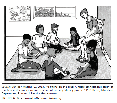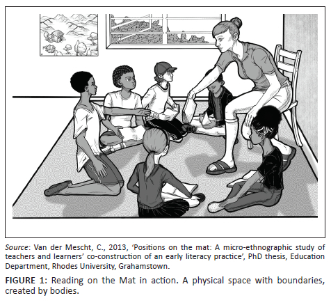 Although other teaching methodologies were used in these classrooms, Reading on the Mat dominated literacy instruction. Every learner in the classrooms of the research came to the Mat every day for reading instruction and the seating arrangement allowed strong normative work as it provided teachers with daily close contact with learners in small groups. Reading on the Mat therefore met the requirement of the research, as a 'bounded series of actions and reactions that people make in response to each other at the level of face-to-face interaction' (Bloome et al. 2005:6). On the Mat phonics drill with cards and other texts was followed by round robin reading of graded readers, closely monitored by the teacher. Each learner or the whole group might be asked a question on the text. Learners not in the group were given work and discouraged from interrupting group activities.