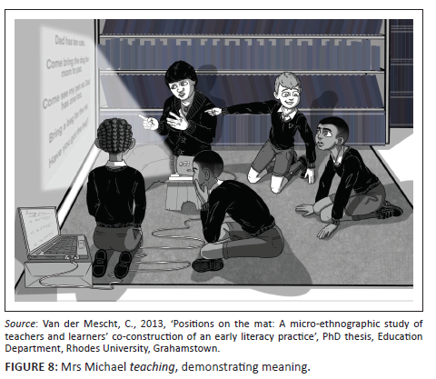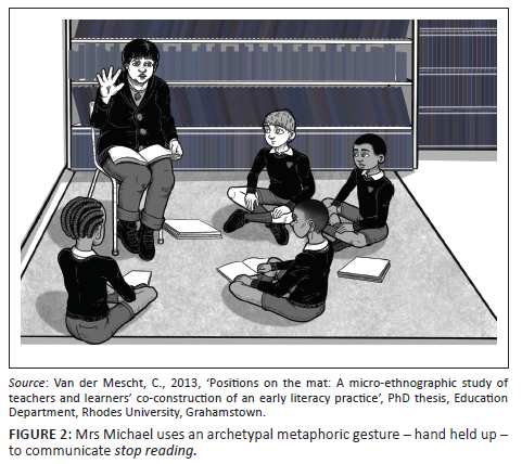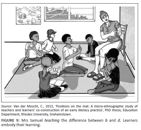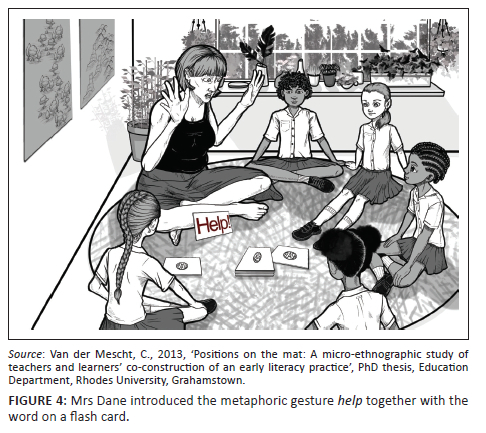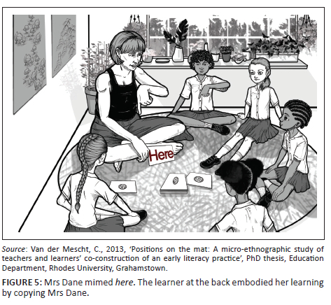 Mrs Dane's practice showed that iconic and metaphoric gestures can be used deliberately by interested teachers as a teaching resource. Her practice demonstrates how the choreography of the event (Erikson 1982) can be taught to young learners, embodied through teachers' enactment and then used deliberately in teaching and learning. In South Afrika, Chikiwa and Schafer (2019) assert that: