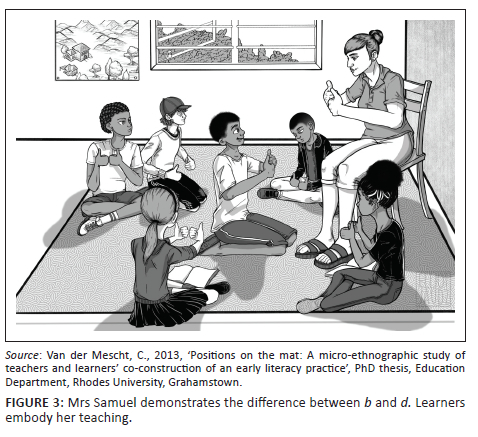 In addition, all the teachers used idiosyncratic gestures of their own invention to teach the content of the lesson and iconic and metaphoric gestures dominated this aspect of their instruction. Iconic gestures often resembled the letter shapes that were being taught. Mrs Michael, for example, made a Y-shape of the thumb and forefinger pointed at the learner to mimic the Y-shape, verbalising it as 'pointing at you'. Mrs Samuel held David's fists in a hitch-hiker's gesture to demonstrate the difference between b and d as illustrated in Figure 3.