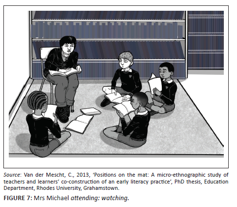In both the attending postures the teachers' faces were immobile, even when they praised learners. Their head-eye orientation was towards the reading learner and their focus was intense and exclusive. They might become fixed in this posture until the learner had finished reading. Teachers' vigilance of the rest of the group was reduced until the reading ended. This rigidity and the continuous glancing between the text and the learner presented the Mat as a place of assessment as well as learning. Verbal communication from the teacher in this posture was minimal. Instead, there were long silences while a learner decoded words in the text. Both attending postures were accompanied by instructions to look at or to point to words in the text. The teacher sometimes joined the reading or provided a correct word, confirming her own focus on the activity. From this posture, the teacher directed turn-taking, sometimes verbally, but mostly non-verbally with a nod or glance as described earlier by McDermott et al. (1978). Because teachers were focused on the learner as well as on their reading this posture contributed to the strong group boundary or external border work maintained on the Mat.