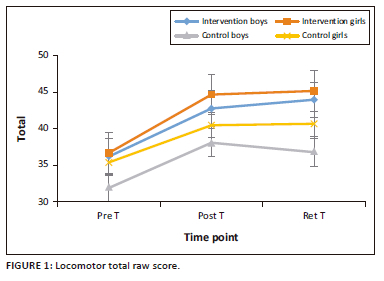 The intervention and control groups showed increased mean scores in most of the locomotor skills from the pre-test to the re-test (Table 1). Higher mean scores were observed in the intervention group than in the control group, although not significantly (p > 0.05), which confirms similar motor skills in the groups at pre-testing. Significant improved mean scores were found in the intervention group from pre-test to post-test in five (run, gallop, hop, skip and slide) of the six locomotor skills that were assessed (only horizontal jump did not improve). Likewise, the control group also improved significantly in five (run, gallop, hop, skip and horizontal jump) of the six skills although with a decrease in sliding. A large significant (p < 0.001; d > 0.8) improvement was observed in both groups from pre-test to post-test (Table 3, also see Figure 2), although the control group had a lower mean locomotor total raw score (LTRS) compared to the intervention group during post-test (Table 1, also see Figure 2). At the re-test, the intervention group also improved significantly in five (run, hop, skip, horizontal jump and slide) of the six skills while no improvement was seen in galloping.