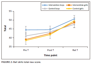 Boys, on the other hand, from both groups, however, performed significantly better than girls in ball skills at pre-testing. These findings again agree with previous research studies among 3-10-year-old Brazilian primary school children (Spessato et al. 2013), 3-8-years Belgian children (Bardid et al. 2016), 6-9-years-old Irish primary school children (Bolger et al. 2018) and 6-years-old Irish primary school children (Kelly et al. 2021). The rationale behind boys being more proficient in ball skills in this study is that boys participate more in street soccer and sporting activities that involve object manipulation, such as soccer, catching and throwing, kicking and bouncing of balls than girls, which is consistent with the findings from Booth et al. (2006), Pienaar et al. (2015) and Walter (2011).