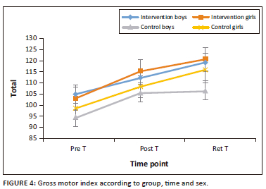 Based on the GMI descriptive ratings in the TGMD-3 manual as displayed in Table 4 and the changes graphically displayed in Figure 3 and Figure 4, boys and girls in the intervention group moved from the 'average' descriptive category at pre-test to 'above average' at post-test. The boys in the intervention group maintained an 'above average' rating at re-test, while the girls in the intervention group shifted to a 'superior' rating at re-test. On the other hand, both boys and girls in the control group had an 'average' rating on the pre-test and the post-test. The boys maintained an 'average' rating at the re-test, while the girls moved to 'above average' at the re-test. It can be concluded from these shifts that are depicted in Table 4 and graphically displayed in Figure 3 and Figure 4 that the overall motor skills of the intervention group benefitted from the intervention, and this benefit was sustained, while the motor skills of the control group stayed more or less on the same level, especially in the boys. Although maturation effects are clear from these results, the intervention does show sustainable effects on the intervention group that differ from what was seen in the control group.