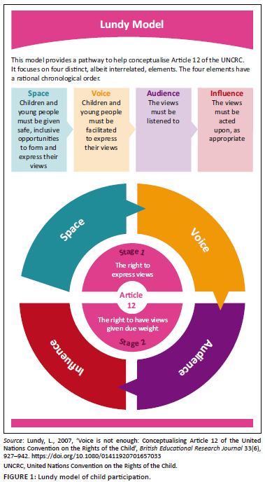 The Lundy model has been adopted by the South African Department of Social Development in the National Child Participation Framework (Republic of South Africa [RSA] 2018). Child participation, in this framework document, is defined as 'the active involvement of children in the decisions, processes, programmes and policies that affect their lives' (RSA 2018:4). Significant to the context of this opinion piece, the document makes provision for the rights of younger children; they too need to be heard and participate in educational decisions that affect them (RSA 2018:31). While the importance of child participation is acknowledged in this document across a range of settings, including schools, reviews of the status of child participation in South Africa indicate a gap between the intent and actual implementation of the legal framework (Grant 2015; Grant & Kajee 2020; RSA 2018).