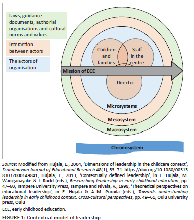 Leadership is the driving force behind every organisation, including ECE centres. According to Hujala, Waniganayake and Rodd (2013), leadership is a wide-ranging theoretical phenomenon, and scholars have various leadership philosophies from various perspectives. The theoretical framework of this study lies in the contextual leadership theory, which is built on Bronfenbrenner's (1999) bioecological theory of education (Hujala 2004, 2013; Nivala 1998).