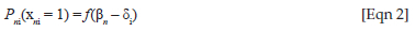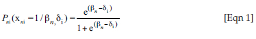 The simplest mathematical definition of the RMM (dichotomous model) estimates that, a person 'n' of ability βn, faced with an item 'i' of difficulty δi, has the probability Pni, of giving a right answer (xni = 1), represented by Equation 1 and Equation 2: