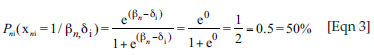 Equation 2 shows that the probability of a learner 'n' of ability βn responding correctly to an item 'i' of difficulty δi is a function of the difference between the person ability and the item difficulty only. For example, if person ability βn = 0 and item difficulty δi = 0, then substituting these values into Equation 1, yields Equation 3 as follows: