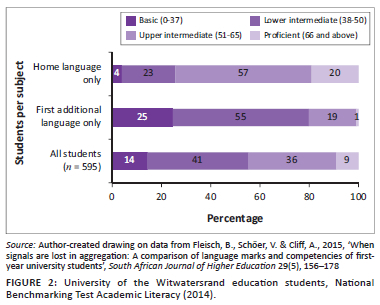 The NBT project was commissioned in 2005 by Higher Education South Africa. In 2018, the project reached maturity as a standalone and self-funding project, hosted at the University of Cape Town (see https://nbt.ac.za). Academic literacy is one of three tests that make up the NBTs: (1) Mathematics, (2) Academic Literacy and (3) Quantitative literacy (Fleisch, Pather & Motilal 2015:156). Figure 2 presents the academic literacy results of students entering the University of the Witwatersrand's B.Ed programme in 2014. The majority of these students use English as an additional language and wrote the EFAL examination papers.