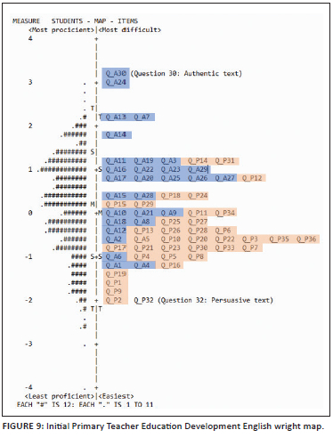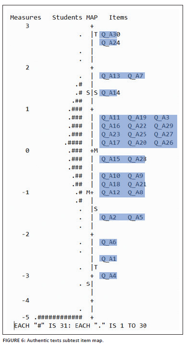 The Wright Map in Figure 6 shows how the student scores were spread across the items based on an authentic text. In this case, each '#' denotes 31 students, while each '.' denotes 1 student. Once again, floor effects are evident with 373 students at the very bottom of the scale. The authentic texts subtest did not suffer from ceiling affects, as there were difficult questions (QA_30 and QA_24), which were at a suitable difficulty level for the top attaining students.