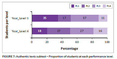 Figure 7 presents the proportions of students at each performance level on items based on an authentic text.