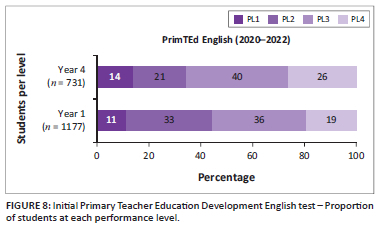 From 2017 to 2021, PrimTEd has collected assessment evidence that shows fourth-year students not significantly improving on the first-year results and only performing 3 percentage points higher than first-year students, on the same PrimTEd English test. As shown in Bohmer et al.'s (2022) analysis of the grade 12 language results of university entrants, it is evident that the limited competence in English that student teachers bring from school persists to the end of the 4-year B.Ed programmes. This limited competence does not only present a challenge to universities but also suggests that the vicious cycle of low standards in schooling continuing into ITE reported in Taylor (2019) is yet to be broken. Bohmer and Pampallis (2022:2) note that Education degrees have grown in popularity enormously, realising in the last decade a more than 200% increase in take-up, noting that '…universities opened more spaces or otherwise encouraged students to study teaching, or alternatively the teaching profession gained popularity among students for other reasons'. This can also be seen as indicative of the strategy to increase the production of ITE graduates by the Department of Higher Education and Training (DHET) as a part of their Teaching and Learning Development Capacity Improvement Programme (2021).