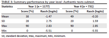In the authentic texts subtest, the Year 1 score (Mean = 38%, SD = 28%, n = 1177) was very low, and even though the Year 4 cohort (Mean = 49%, SD = 20%, n = 731) did better, the mean score remained below the 50% mark (Table 3).