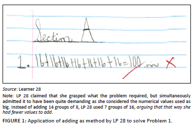 Table 1 specifies that 19 learners applied addition as a means of calculating problem 1. From the 19 addition methods, 12 involved just adding of numerical values, two solutions combined adding with creating sketches, four solutions combined adding with grouping. Only one solution combined adding with multiplying.