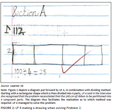 An additional noteworthy observation was learners' ability of employing particular arithmetic methods jointly with drawings (or diagrams). Upon planning their methods, certain learners merged different methods to facilitate the problem-solving process. This is indicative of the fact that learners recognised that it was possible to amalgamate methods to facilitate the problem-solving procedure. As alluded to formerly, the predominant couple of methods that were amalgamated were identified as simple arithmetic calculations and sketches or diagrams. The constructed sketches would reflect learners' grasp or their conception of what the problem expects them to do. The type of sketch relates to the suitable arithmetic operations that would generate the solution. This finding aligns with Mudaly (2012) who maintains that the use of drawings when solving problems actively involves learners in constructing meaning.