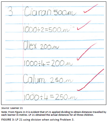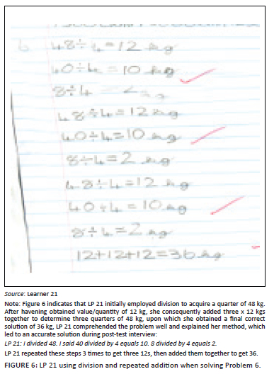 The findings state the way in which the six questions are structured together with Table 1, Table 2, Table 3, Table 4, Table 5 and Table 6. These tables provide insight into the problem-solving methods learners used or applied for six problems in the test. A few images are included to provide a better sense of the problem-solving methods that learners applied. Next to each image appears a description of what the image depicts, which integrates the learners' responses on the task sheet (document analysis) with the responses from the interviews. The following methods are depicted in Figure 1, Figure 2, Figure 3, Figure 4 and Figure 5: (1) adding, (2) amalgamating dividing and creating a sketch or diagram, (3) dividing, (4) multiplying, (5) merging dividing and adding: