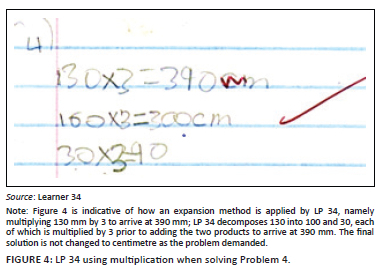 The phenomenon of employing a combination of methods for solving word problems that was alluring and impressive was the variety of differing combination employed when engaging in specific calculations. Certain combinations merged two, three or more methods to solve a single word problem. Saygili's (2017) research findings confirm this when stating that learners resort to a multiplicity of methods when solving non-routine and unfamiliar problems. Upon executing multiplication as an operation, certain learners resorted to decomposing the larger numbers into smaller constituent numbers. Each (constituent) smaller numeric value is then multiplied by the specific number, the answers are regrouped, and through addition one can arrive at the final answer. Likewise, learners multiply large numeric values by means of recurrent addition. This method was preferred by those who felt more at ease applying addition, rather than multiplication.