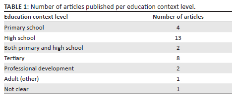 The 31 analysed papers considered a broad range of education contexts and levels, ranging from primary school to tertiary level, and including professional development situations. However, the number of articles per category varied considerably (see Table 1).