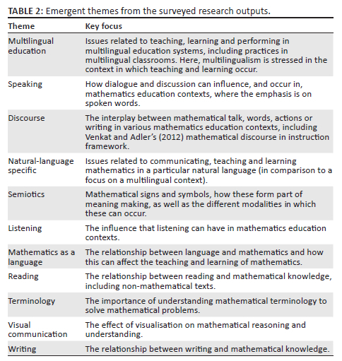 Table 3 provides a summary of the 11 identified areas of research in the analysed papers. We chose to categorise each paper into only one area of research. If a paper referred to more than one of the identified areas, we only categorised it into its main (most relevant) theme based on the study's focus. For example, although Tobias's (2003) paper briefly mentions multilingual classrooms, his paper mainly examines linguistic elements of classroom mathematics. The paper was thus categorised under 'mathematics as a language'.