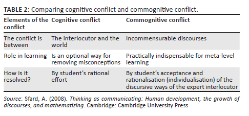 Too often learners are considered 'good' at mathematics because they conform very well to society's expectations, and those who do not conform are usually labelled as 'outcasts' and 'weak at mathematics' (Heyd-Metzuyanim & Graven, 2016). This view may affect learners' formations of their identities in the classroom community. Participation in explorative discourse requires a good understanding of some already endorsed mathematical knowledge; hence rituals can be thought of as significant building blocks towards explorations (Lavie et al., 2019; Nachlieli & Michal, 2019). Sfard (2008, p. 223) claims that rituals and deeds are 'developmental predecessors of explorations'. Hence, meta-level learning of mathematics moves from ritualistic discourse participation towards explorative participation, and the ritual develops into exploration through the process of rationalisation. At the beginning of learning, when a routine constitutes objects or metarules unfamiliar to the learner, learning becomes highly unlikely. Hence, at this stage, for beginners to be conversant with a certain mathematical discourse, they rely on imitating a knowledgeable other in that specific discourse. The beginner imitates the rules and procedures of the knowledgeable other, adapting them until they individualise the mathematical discourse, but at this early stage, their discourse participation is ritualised. At this stage, beginners know how to perform a certain routine, but have not struck the balance as to when to perform it. For learners to be able to transform their rituals into explorations, they need to reflect continually on their performance of the ritual, while examining the rationale for the expert performance as they participate in mathematical discourse. In Vygotsky's idea, ritualistic discourse participation occurs in the Zone of Proximal Development (ZPD), where the learner can participate in the collective patterned thinking or the performance of a routine, but is incapable of individual performance. By contrast, explorations look for the connectedness of different routines so that once learners have acquired explorative discourse participation, they hold a network of interconnected routines, instead of disconnected ones. The explorative form of objectifying particular routines allows learners to compress mathematical knowledge to allow them to solve a multitude of mathematical problems with few routines. Furthermore, commognition recognises that metalevel learning occurs 'when the learner is exposed to commognitive conflict' (Sfard, 2008, p. 260). Sfard (2008, p. 296) describes the commognitive conflict as the conflict that 'arises when communication occurs across incommensurable discourses'. Interlocutors who are in commognitive conflict participate in discourses that differ in their utilisation of words, mediators and routines, which might allow them to endorse narratives that seem contradictory. Commognition warns the commognitive researcher not to confuse commognitive conflict with cognitive conflict. The difference is tabulated in Table 2.
