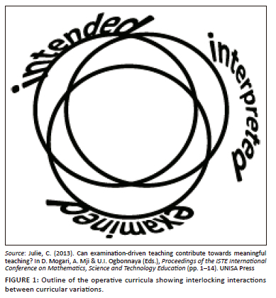 The overlapping circles in Figure 1 emphasise interlocking relationships between the curricular variations. The examined curriculum at the bottom of Figure 1 signals a foundational role and a permanent and vital part of the education system, which can be characterised as 'examination-driven' (Julie, 2013; Wideen et al., 1997).