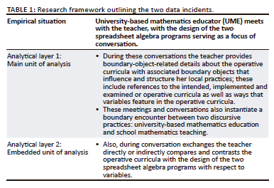 We used what Niss (2007) calls a research framework to answer the main research question. We used this framework because it consists of an organised network of concepts, namely the various policy boundary-objects-related to the education system and any school in general, and the two SAPs (see Table 1). The main and embedded units of analysis inform the outline of this framework. In the case of the first unit of analysis, the teacher makes no immediate references to the two SAPs. Instead, she provides details on the operative curricula with attendant boundary objects, and what it takes to work in her school and its circumstantial or entangled conditions. In the case of the second unit of analysis, she comments specifically on how and where algebra and variables feature in the operative curricula with attendant boundary objects, in relation to the design of the two SAPs. The left-hand column labelled as 'layers' denotes the subtleties of multi-layered engagements, namely the empirical situation (top row) and two interrelated 'analytical layers' (Zeiss & Groenewegen, 2009). The second row (Analytical layer 1) indicates the main unit of analysis. The third row (Analytical layer 2) indicates the embedded unit of analysis, for example the SAG on algebra and variables and the design of the SAPs. We opt for a main and an embedded unit of analysis to avoid a 'reduced analytical representation' of this teacher and her school site, as noted earlier. This means we avoided selecting conversation excerpts that focus solely on the SAPs. More interestingly, a separation between the two units of analysis becomes difficult, because during conversation the teacher can reference details outlined in layers 1 and 2.