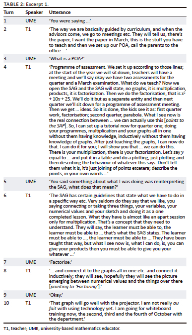 Excerpt 1 (see Table 2) contains evidence related to the main unit of analysis. The intended curriculum, spelled out in policy documents, guides the teacher's local practices and that of her colleagues. We note this from the change in epistemic order between Turns 1 and 2, where she notes, 'we are basically guided by curriculum'. As boundary objects, the POA and SAG provide content details for each school subject as the academic year progresses, which includes algebra (see Turns 1, 2 and 3). The POA and SAG details indicate the intended as well as the assessed or examined curricula. This should be noticed from the A in POA and in SAG. At the beginning of the school year, she attends meetings organised by the curriculum or subject advisor. During these meetings the POA and SAG become boundary objects between these advisors, teachers and parents, and thus a means of communication between the school and the district office (see Turn 4). The subject advisor's visits to schools thus aim at helping teachers interpret and implement these details outlined in these boundary objects. From here we should note that teachers have professional obligations to the stakeholders of school mathematics, namely learners, the principal and parents, for example. Subject advisor visits aim at fostering coherence in teachers' classrooms. For example, she notes 'we set up our POA'. Interestingly, the epistemic order in Turn 3 shows that the UME was not familiar with the 'POA' per se, as a boundary object between the stakeholders, namely teachers, parents and subject advisors. Turn 3 thus signals a boundary encounter where the UME was ignorant of details about the teacher's local practice.
