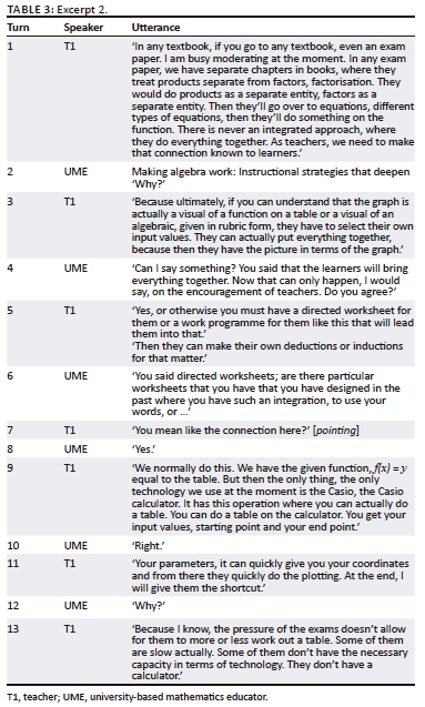 In each case, there is a table with three columns labelled: turns, speaker (T1 for 'teacher' and UME for 'university-based mathematics educator') and utterance. We use the acronym UME to emphasise the distance and boundary encounter between the university and the school.