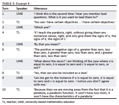 We interpret 'signs' to mean different integer values, which are needed to compute the discriminant and to decide on the nature of the roots. She keeps the content of the examined curriculum in mind or in view (see Excerpt 1). The UME asks her to be specific about her lead questions (see the epistemic order in Turns 3 and 5). The UME continues to ask her to consider boundary instances, that is, where the parameters as placeholder variables assume the values of zero (see the epistemic order in Turns 7 and 9). She makes clear that as for her local practices, the resulting changes of the parameters will not display the 'characteristics of a parabola' or a 'parabolic function' (see Turn 10). As we can see, in the ecology of studying and teaching the mathematical object - a parabolic function, in this case - she keeps the content of the examined curriculum in view (see Turn 4 in Excerpt 3 [see Table 4]).