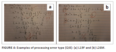 L19F and L26M in their scripts (Figure 4) revealed a lack of comprehension of the equations which led them to commit transformation errors; hence, they could not correctly complete the square on both sides and then solve the problem. L19F used an incorrect coefficient of x as