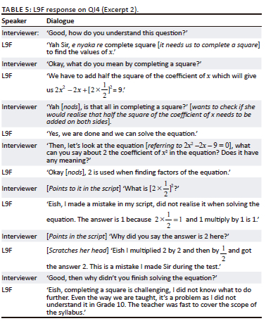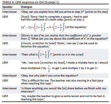 In the interview sessions learners who were selected to explain how they answered the QE questions showed difficulties when solving QE by CS. They seem to have misunderstood the topic as they could not justify the procedures used to solve QE problems and three of them (1 male and 2 female) indicated that the strategies used to teach this topic were not easy to understand. Table 4 is the interview conducted with L8M and L9F whose scripts were used in Figure 3 and who displayed transformation error type. The interviews intended to understand how learners answered the questions.