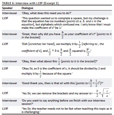Tables 6 and 7 looked for the reasons why learners answered QI8 using their respective procedures. The two tables with excerpts revealed learners experiencing difficulties in solving QI8 using the equation ax2 + bx + c = 0 to derive the formula