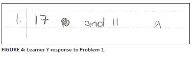Grade 10 participants' problem-solving efforts clearly reflected severe reading and comprehension impairements which hampered understanding and retarded progress or prevented participants from arrving at solutions. This state of affairs was observed in those participants who demonstrated level 1 modelling skills throughout the set of five problems. As illustration, consider the instance (in Problem 1) where five participants could not decipher the relationship between 27 and 6 and the notions of 'sum and difference'. The accompanying mathematical statements from these participants were questionable and indicated improper use of the equal sign. Learner X was obviously unaware that 27 was the correct answer to the addition of the two numbers, and not half of 27. It was also observed that learner X failed to figure out the quantities between which a difference of 6 exists, and as a result came up with an incorrect number sentence, namely